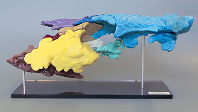 Ausguss der linken Nasennebenhöhlen beim Rind. Die Kompartimente sind zur besseren Unterscheidung unterschiedlich eingefärbt. Montiert auf einem Acrylglaspodest.